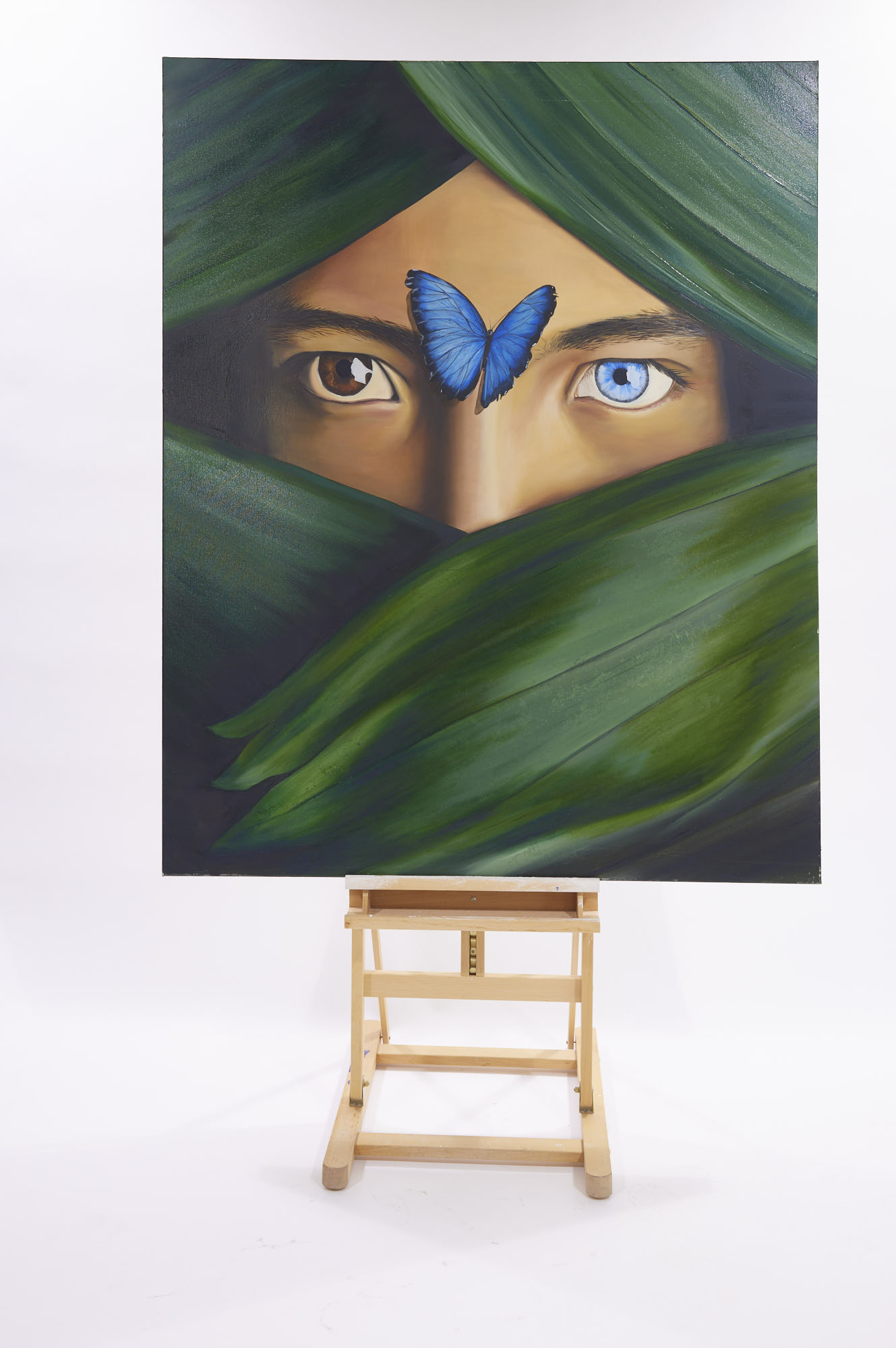 The butterfly, delicately perched on the forehead, symbolizes transformation and beauty. This detail reinforces the idea of an inner change, a metamorphosis towards a higher version of oneself. The gaze, captivating in its intensity, becomes a portal to an inner world full of enigmas.
